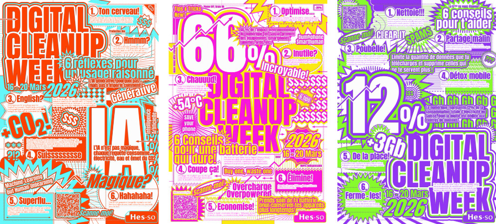 Pour cette quatrième édition, plusieurs activités ont été proposées à la communauté HES-SO : ateliers de sensibilisation et pratiques, conférences… , ainsi qu'une campagne d’affichage conçue en collaboration avec des étudiant∙es de l’ECAL, offrant de nombreux conseils pour prolonger la durée de vie de nos smartphones ou ordinateurs, réduire la quantité de données téléchargées et stockées, ou encore adopter un usage raisonné de l’IA générative.