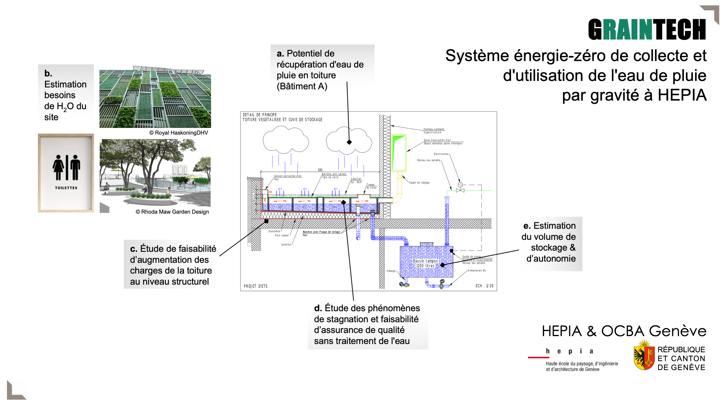 Le projet a été lancé en collaboration avec l’Office Cantonal des Bâtiments (OCBA) de Genève pour réduire la consommation d'eau potable à l'HEPIA, où la chasse d'eau des toilettes représente à elle seule 3 160 m³ par an (25 % de la demande annuelle en eau de l'école), alors que les besoins futurs en irrigation sont estimés à 892 m³ par an. L'approche a consisté à analyser la demande en eau, les contraintes structurelles, les exigences en matière de qualité de l'eau et les précipitations.
