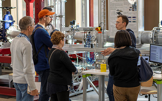 Les participant·es ont ensuite découvert le Labo Hydro, une halle de tests parcourue de tuyaux où sont évaluées des turbines de production d’électricité. Cette visite a mis en lumière les recherches sur la fatigue des matériaux et la cavitation, des éléments essentiels pour améliorer le rendement énergétique.