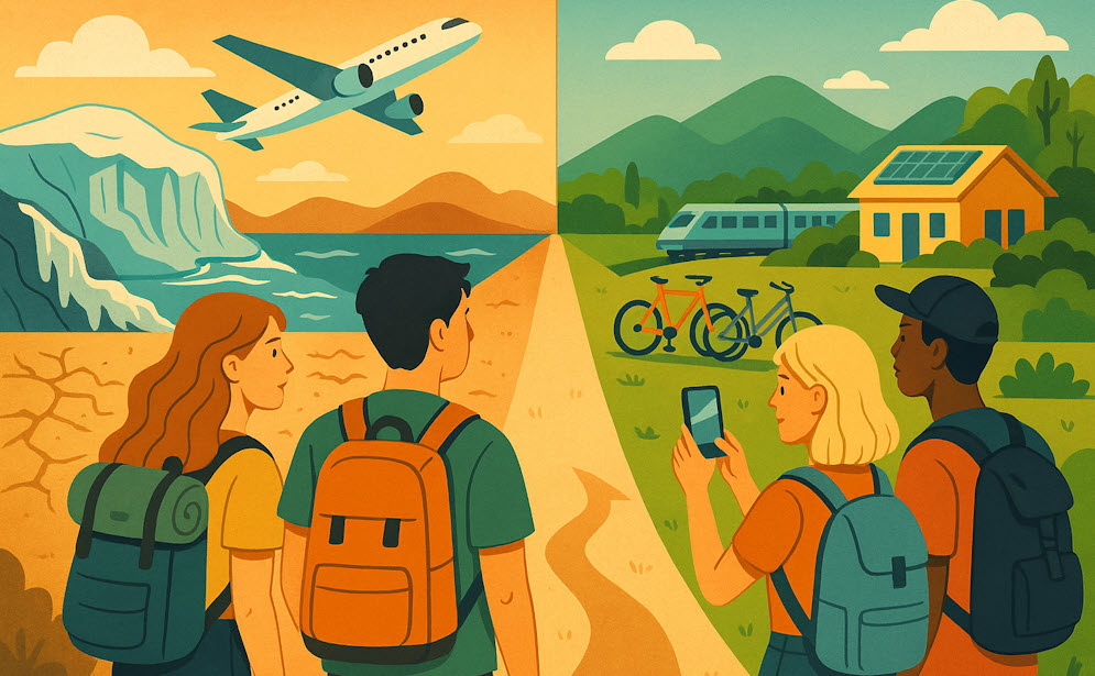 Le tourisme représente 5 à 8 % des émissions mondiales de gaz à effet de serre, 75 % du CO₂ étant lié aux déplacements vers et depuis les destinations. Il contribue au changement climatique à la fois directement par ses émissions et indirectement par l'utilisation des terres pour les infrastructures. À son tour, le changement climatique affecte le tourisme par le biais de conditions météorologiques extrêmes et de conditions de voyage modifiées. La génération Z (née entre 1995 et 2010), qui représente aujourd'hui environ un tiers de la population mondiale, devient un acteur clé du tourisme durable. Pourtant, on sait peu de choses sur ses valeurs et ses habitudes de mobilité. Il existe un écart entre la conscience climatique de la génération Z et son comportement réel en matière de voyages, en particulier pendant les vacances. Des études montrent que les gens relâchent souvent leurs normes de durabilité lorsqu'ils sont en vacances, considérant celles-ci comme une pause dans leurs responsabilités quotidiennes. Ce phénomène est connu sous le nom de home-away-gap.