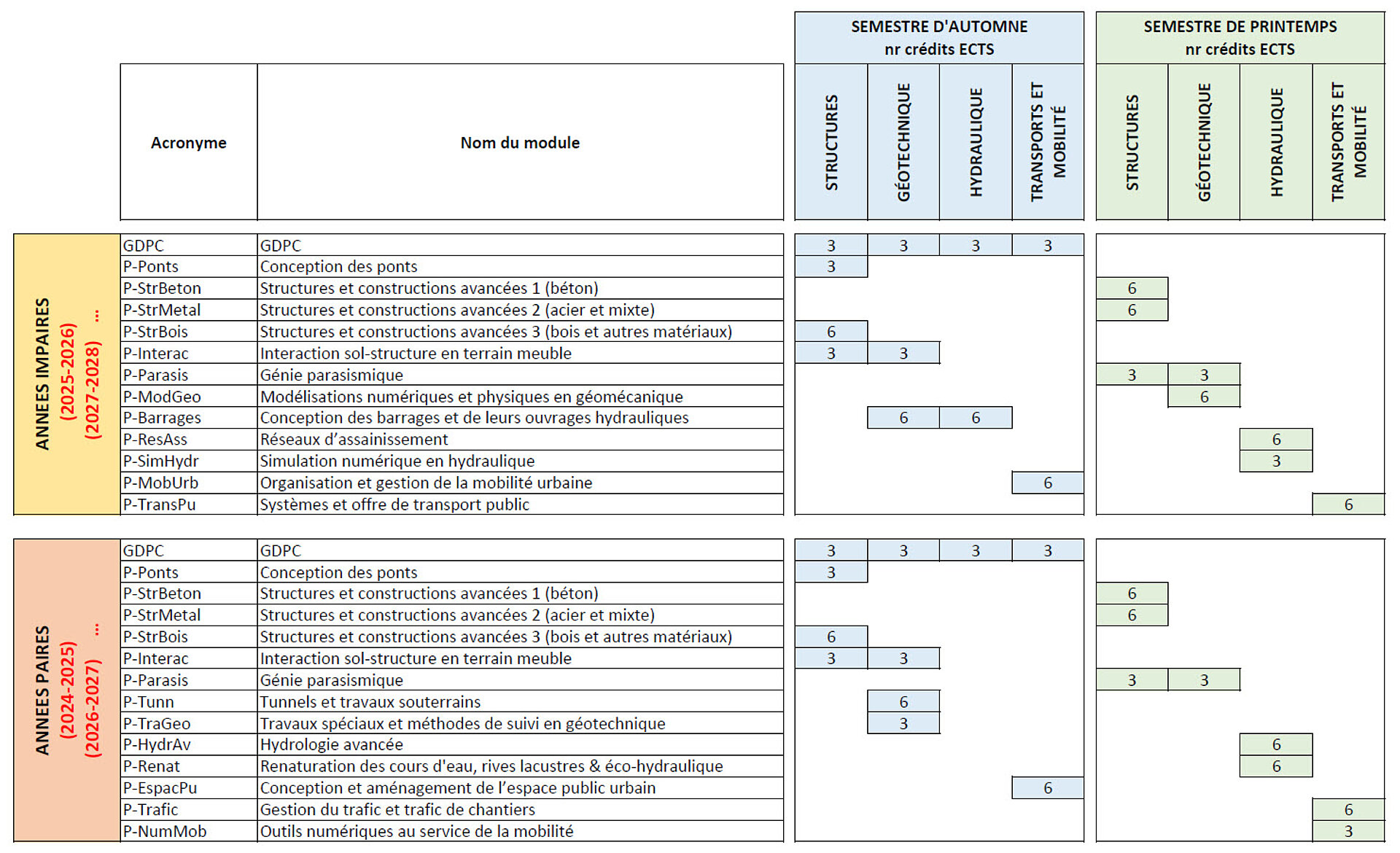 Le plan d’étude de l’orientation Génie Civil est conçu de sorte que le champ disciplinaire « Structure » peut être suivi avec un cursus à plein temps (PT) ou à temps partiel (TP), alors que les champs disciplinaires « Géotechnique », « Hydraulique » et « Transport et Mobilité » sont offerts uniquement avec cursus à temps partiel (TP).
