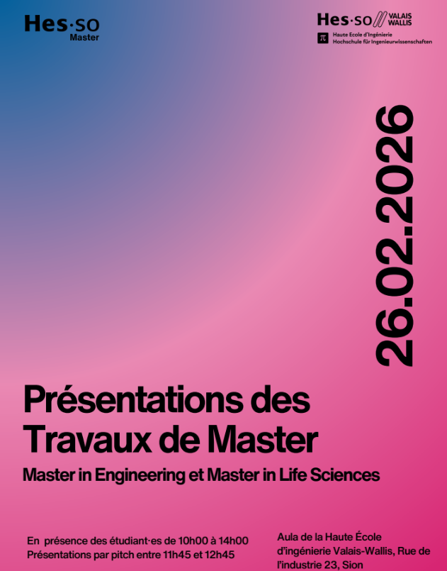 Ces présentations seront prolongées par une exposition des Travaux de Master du 23.02. au 27.02.2026 à la Médiathèque de la Haute école d'ingénierie Valais-Wallis.