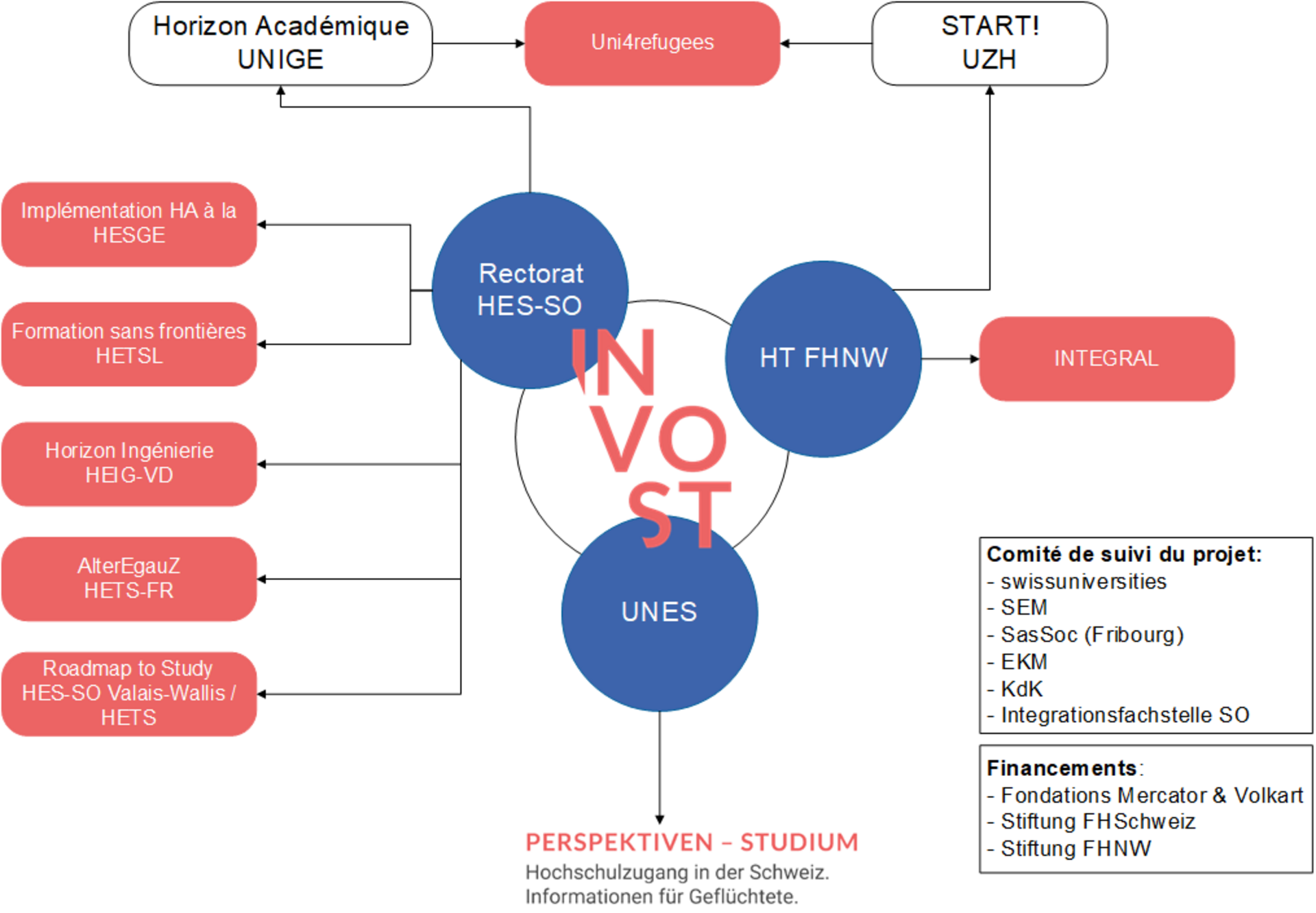 Dans cette perspective, la HES-SO a lancé en 2021, en collaboration avec l'UNES (Union des Etudiant·es de Suisse) et la Haute école Technique de la Haute école spécialisée du Nord Ouest de la Suisse (HT FHNW), le projet INVOST  (Integrationsvorstudium) visant à promouvoir le retour aux études des personnes réfugiées et des requérant·es d'asile via une passerelle favorisant l'intégration sociale et académique de ces personnes.